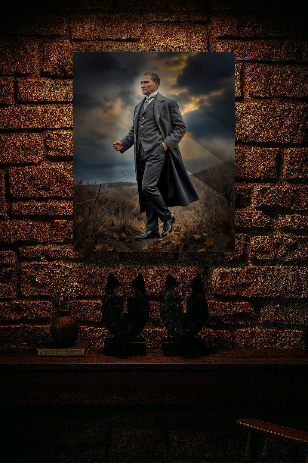 Zamanın ötesine uzanan karizmatik bir duruş, temperli camın ışıltısı ve yüksek çözünürlüklü UV baskı ile hayat buluyor. Güç, zarafet ve liderliğin simgesi olan bu eser; ışığın kırılmasıyla daha da canlı, daha da etkileyici bir görünüme kavuşuyor. Yaşam alanınıza sofistike bir atmosfer kazandırır.